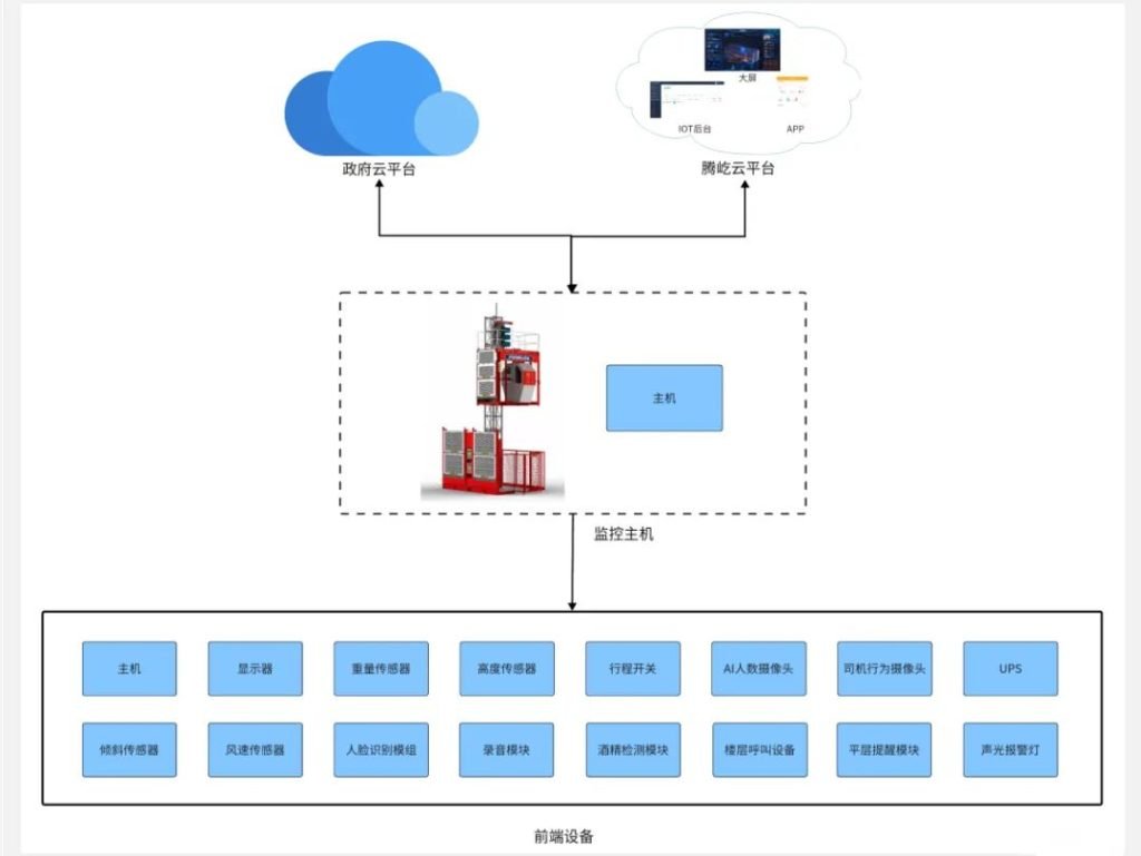 升降機感知預警系統(tǒng)由物聯(lián)網(wǎng)終端和開放平臺組成,終端采集升降機限位數(shù)據(jù) , 能夠?qū)λ緳C進行語音提醒風險情況,如超重、超員、沒佩戴安全帽、關(guān)門沒到位、平層未到位等。