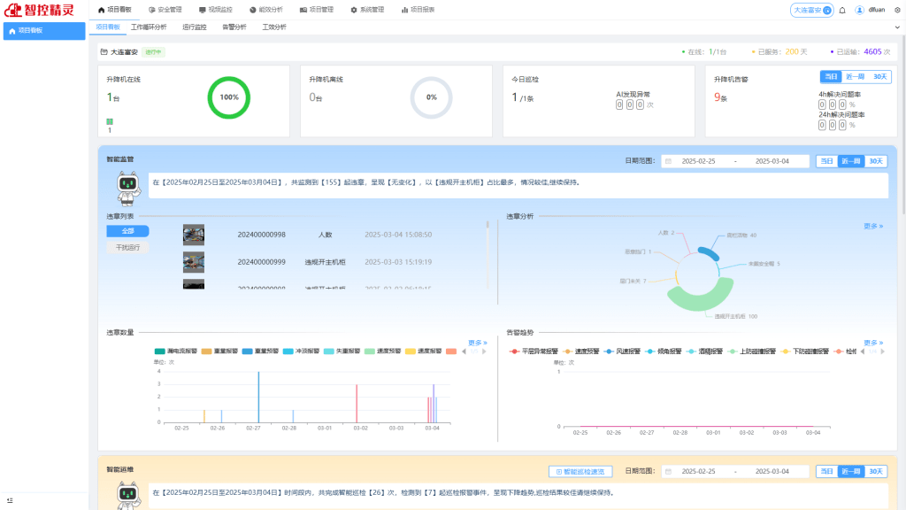 【智能監(jiān)管】具備運(yùn)行監(jiān)控、遠(yuǎn)程管理、消息通知、違章告警、不文明行為識(shí)別、數(shù)據(jù)分析、工作報(bào)表等功能。