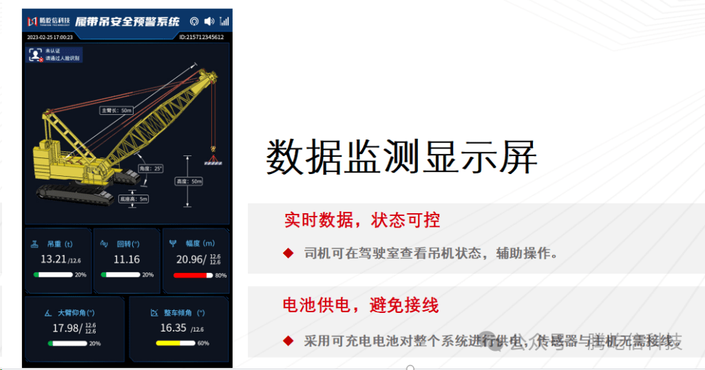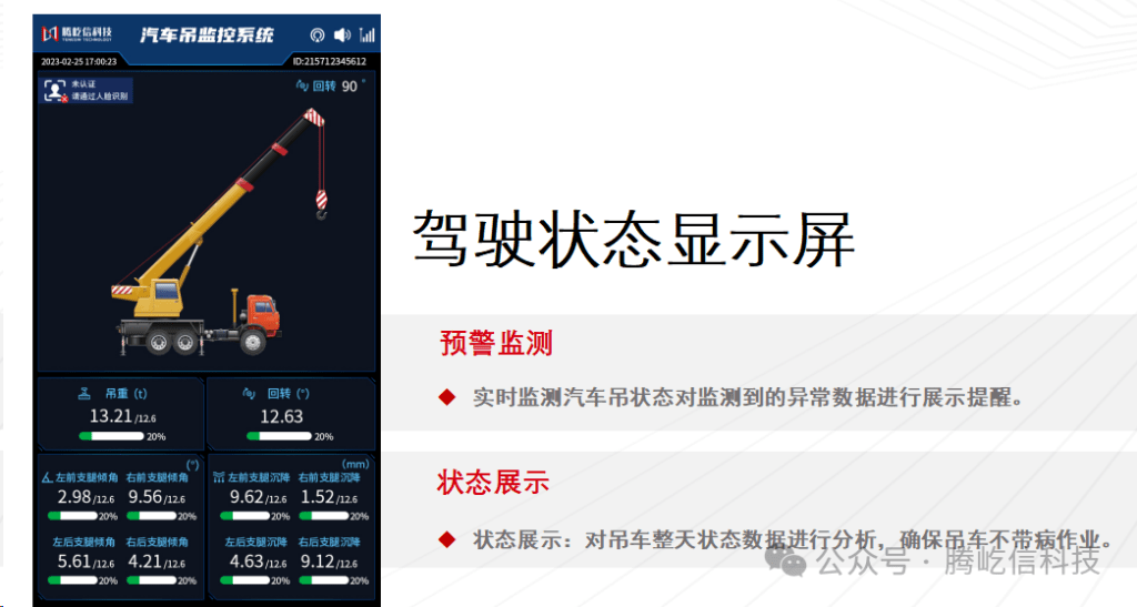 - 可視化呈現(xiàn):屏幕顯示實(shí)時(shí)監(jiān)測(cè)結(jié)果和警報(bào)信息,便于司機(jī)查看吊車(chē)狀態(tài)。