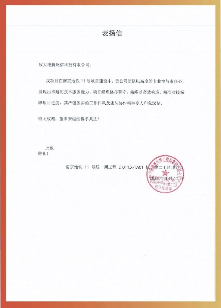 近日,大連騰屹信科技有限公司收到來自南京地鐵11號線項目建設(shè)方的表揚(yáng)信。信中高度肯定了我司團(tuán)隊在項目施工中展現(xiàn)的專業(yè)技術(shù)能力、高效服務(wù)響應(yīng)及嚴(yán)謹(jǐn)務(wù)實的工作作風(fēng)。這份認(rèn)可不僅是對項目團(tuán)隊的全方位褒獎,更是對騰屹信”以客戶為中心”服務(wù)理念的又一次生動詮釋。